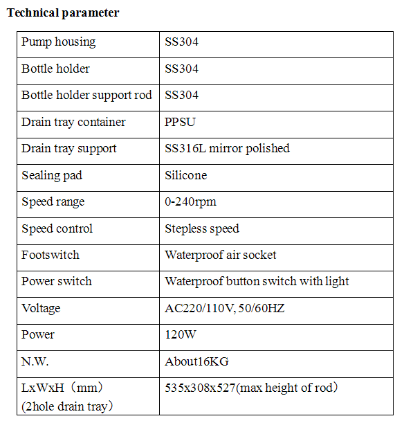 Main parts: Pump device, pump head, screen, bottle holder, drain tray, speed control and footswitch.